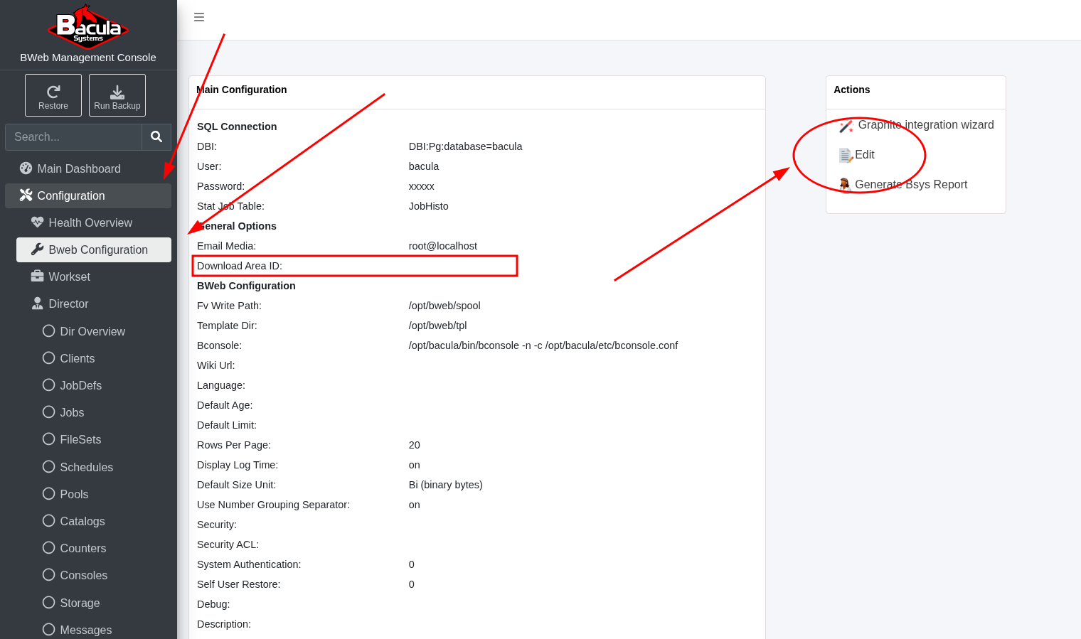 In BWeb left-hand menu, go to Configuration and select BWeb Configuration. If the Download Area ID field is empty under General Options, click Edit.