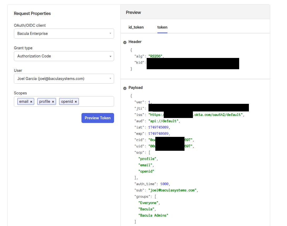 As discussed in the Okta configuration section, most identity providers allow you to preview issued tokens. If BWeb is not being able to process authentication requests, first verify that the access token is valid and includes the required groups claim.